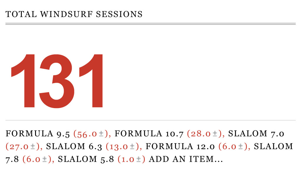 I recorded all my windsurfing sessions this season via twitter @usa4 and then at the end of the season organized all the data via daytum