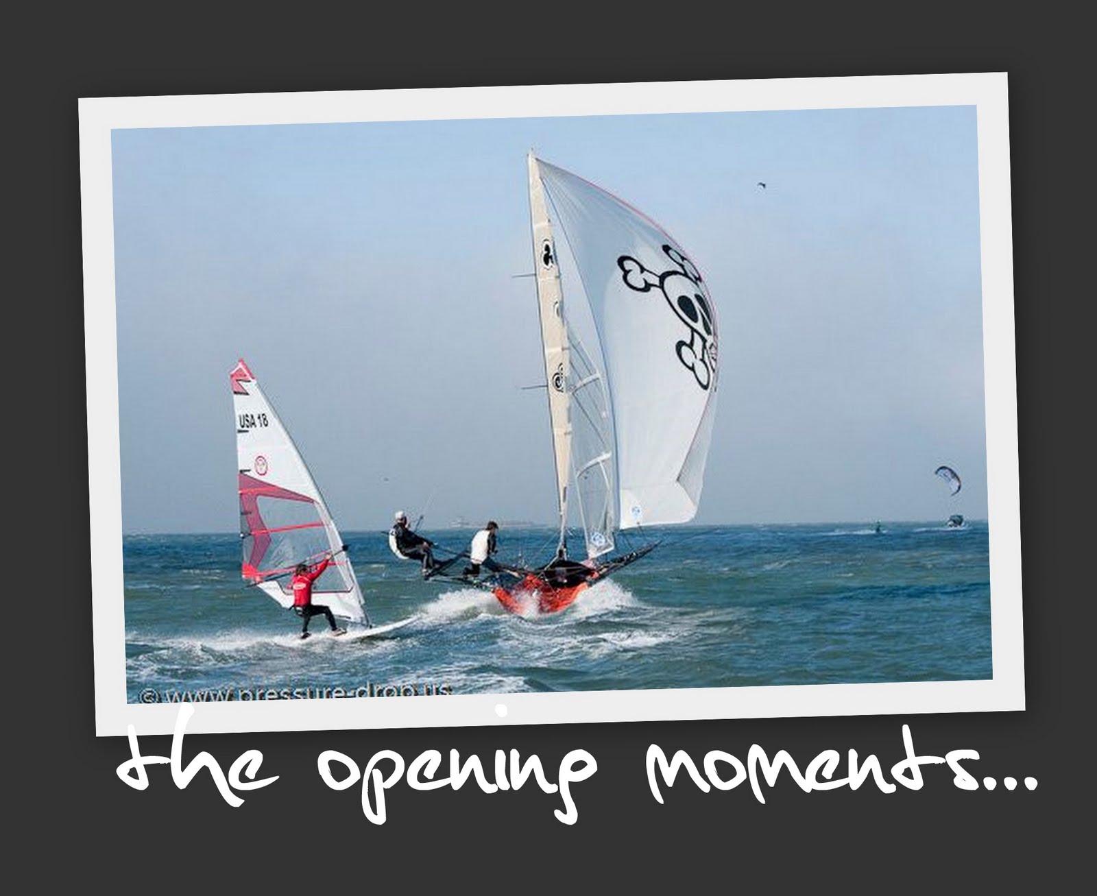 The start was pretty chaotic with kites, skiff and boards all running at different angles and speeds across the line. I made a few quick calls to duck the port tackers (yes- duck the port tackers)in exchange for staying upright and full speed.